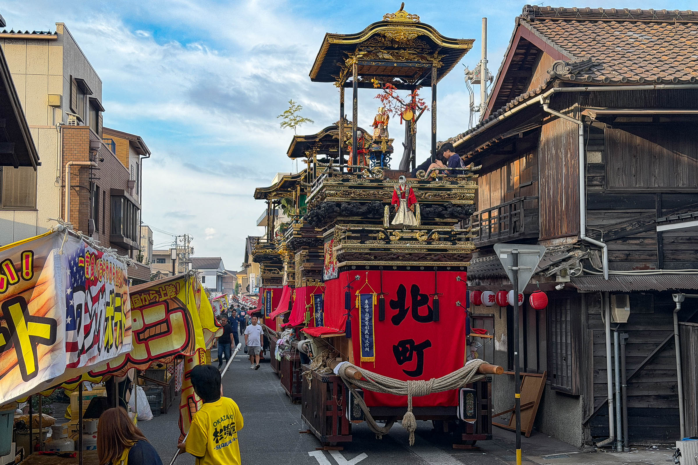 祭りの一番の見どころは、彫刻や刺繍で豪華絢爛に飾られた山車が、街角で豪快に方向転換する「どんてん」です。