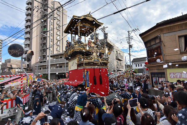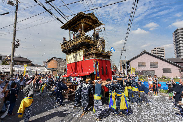 午後になると出番車(当番車)から順番に鳥居前に進み、からくり人形が奉納され、どんてんが終わると町内巡行へと曳き出されます。